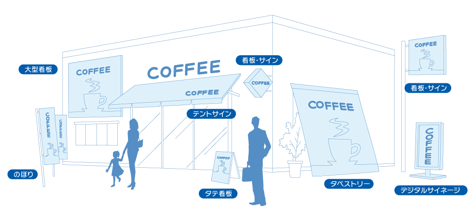 工事現場などの案内看板の製作ノウハウを活かした各種サインのご提案・デザイン・製作を行っています。